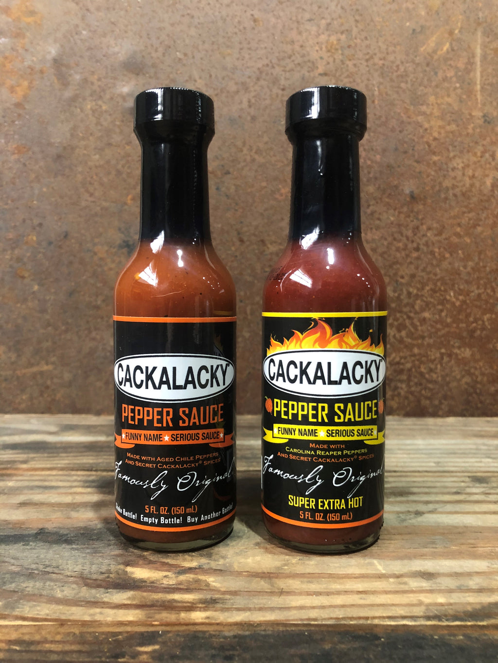 Both of our Famously Original® Cackalacky® *fiery* Pepper Sauce flavors together in the convenience of one order!
