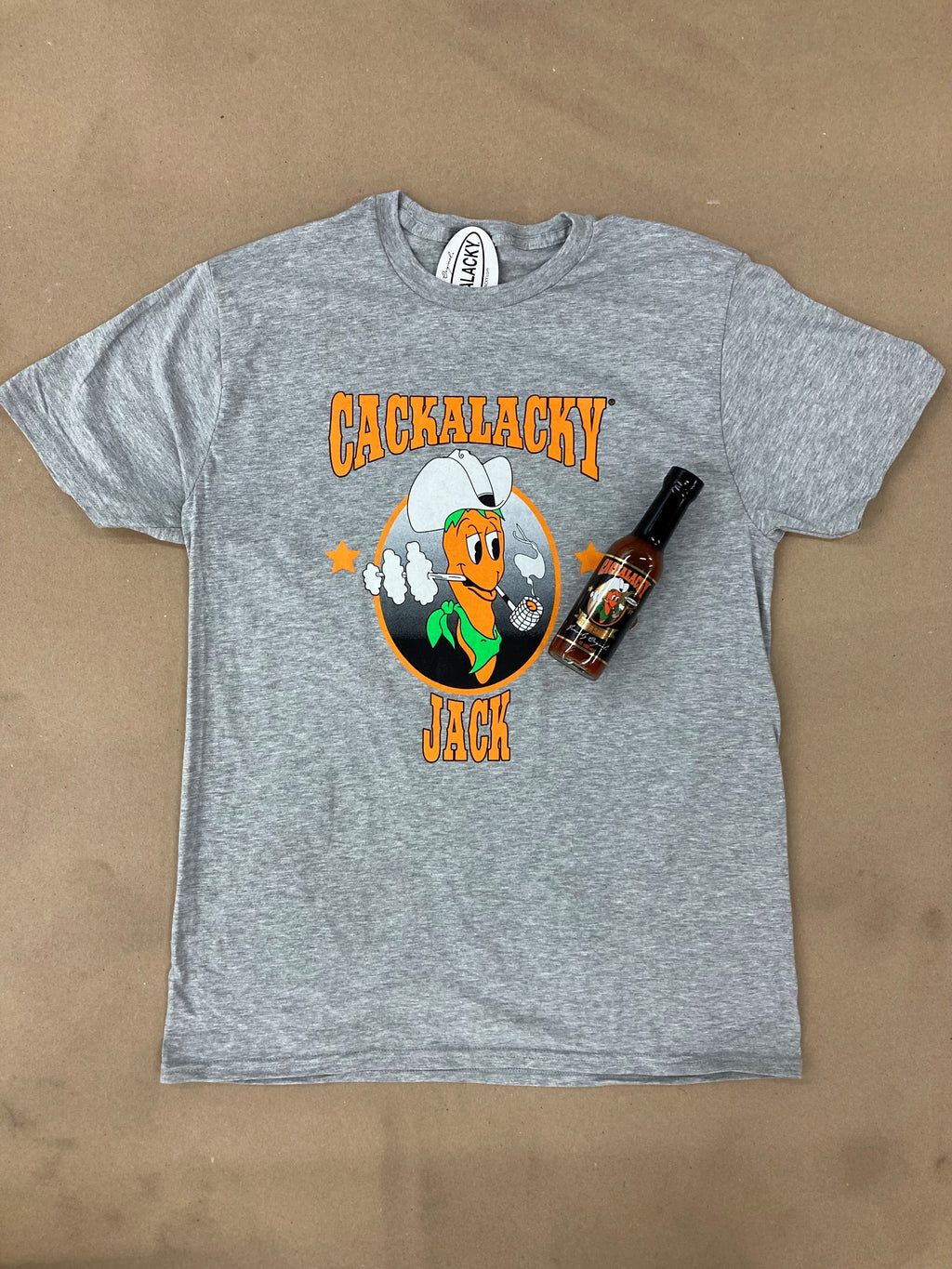 Light gray heather with a deluxe four-color print featuring Cackalacky® Jack "The Smokin' Pepper" logo + "Cackalacky® Jack" Collector's Edition Pepper Sauce